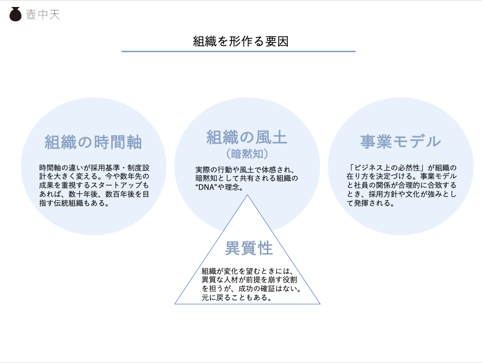 そういう組織のDNAというか設計図って、どうやって作られ、引き継がれていくんですかね? 理念やビジョンやバリューなどの、形式知化されたものだけではない気がするんですよ。暗黙知化された文化風土にあるのでしょうか。