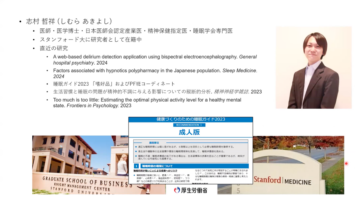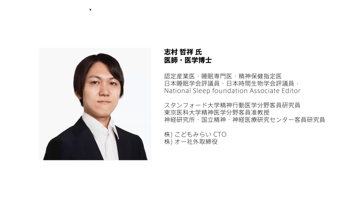 じゃあ、最初に志村さんの登壇者紹介から。精神科医というんですかね、睡眠医学のお医者さんでもあり、世界を股にかけて研究されていて、なおかつビジネスでも、ご自身で経営されている企業も含めていろんなところで活躍されている、まさに異能の方。