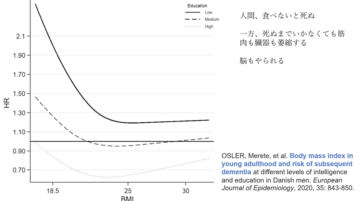 志村:ほかにも研究はいっぱいあって、だいたいBMIが18.5を下回ると、IQが下がってくるんです。当然ですよね。脳みそってエネルギーを食う臓器なので、機能を下げてエネルギーの消費量を節約しちゃうんですよ。
