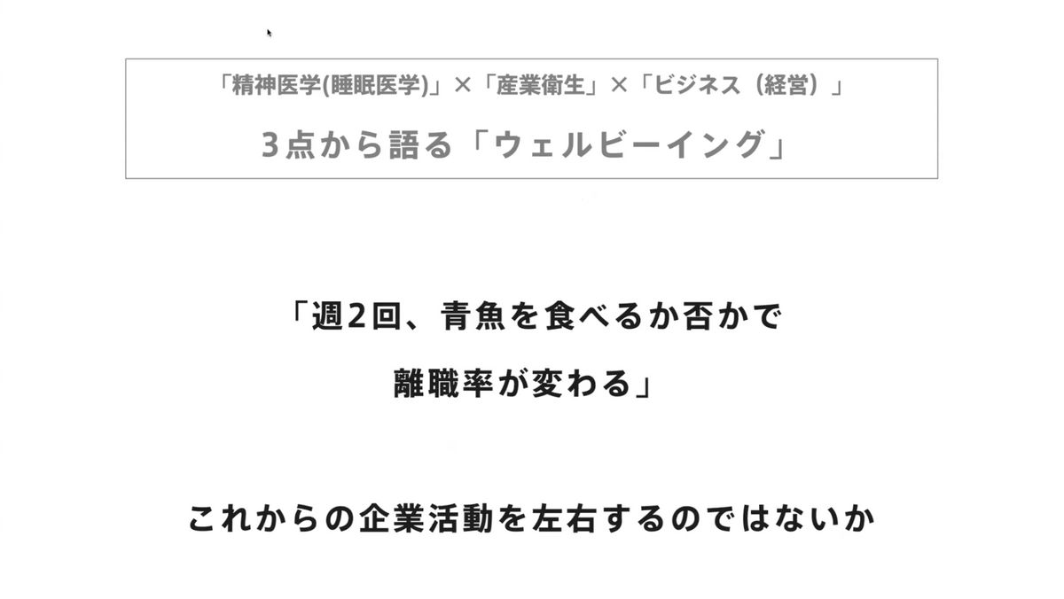 例えば、ここに書いている、「週2回、青魚を食べるか否かで離職率が変わる」などですね。これ、人生が変わると言い切っていいんじゃないかと感じたんですけども。これからの企業活動にワーク・ウェルビーイングは非常に重要なんじゃないかなというところを解き明かすようなお時間にできればと思っております。