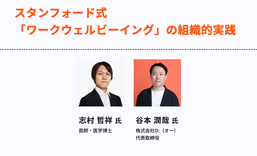 谷本潤哉氏(以下、谷本):みなさん、お待たせしました。株式会社O:(オー)の谷本と申します。この時間からは「スタンフォード式『ワーク・ウェルビーイング』の組織的実践」ということで。