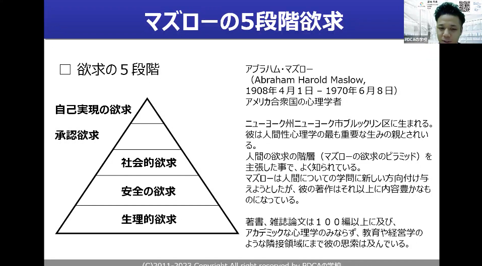 このX理論・Y理論というのは、マズローの5段階欲求というのが関連付いています。この5段階欲求は何なのかといいますと、生理的欲求、安全の欲求、社会的欲求、承認欲求、自己実現の欲求。これがピラミッドになっているようなイメージです。