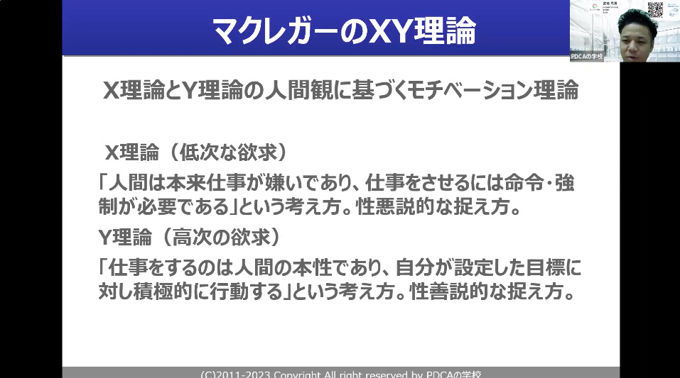 一方でY理論は高次の欲求と書いてありますが、目標を持っている。なので積極的に行動しますよという、いわゆる性善説的な考え方です。