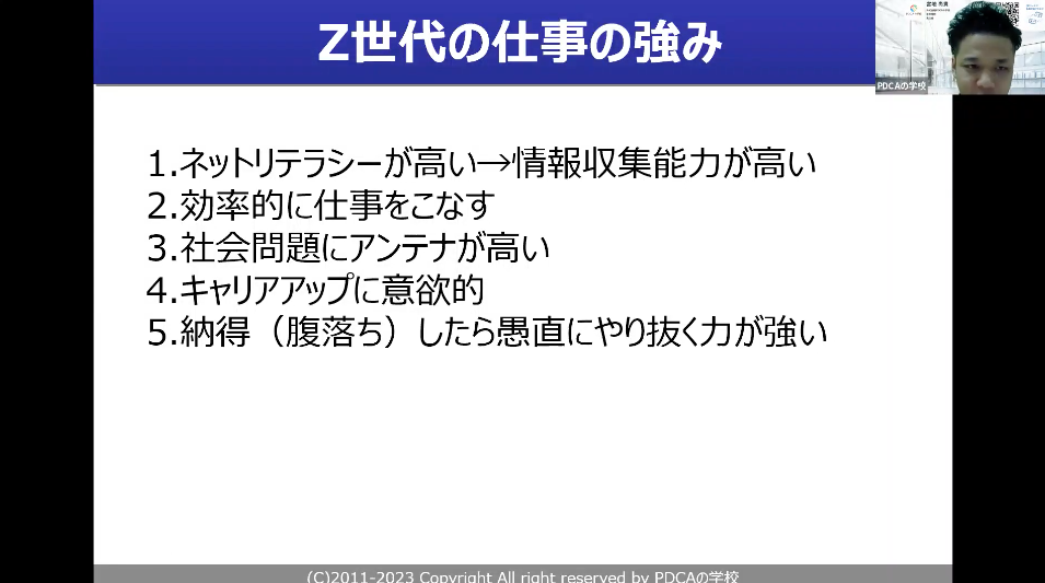 ただ一方で、こういった強みもあります。ネットリテラシーが強い、情報収集能力が高い。ただ、浅い知識を持ってくるかもしれないので、そこはちょっと統制が必要です。