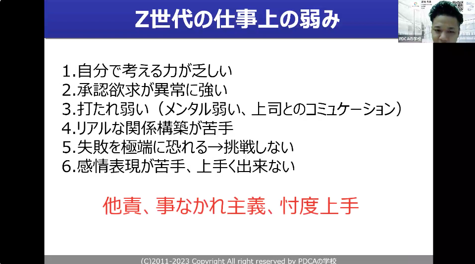 宮地尚貴氏:(Z世代の仕事上の弱みは)自分で考える力が乏しい、承認欲求が強い、打たれ弱い、リアルな関係構築が苦手、失敗を極端に恐れる、感情表現が苦手など。これらが業務上の弱みとなっているので、若年層の初期教育の段階でここらへんを押さえることが求められると思います。