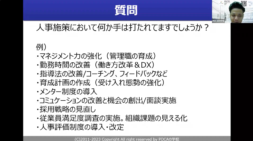 あとは、そもそもの採用でミスマッチを防いでいく。従業員満足度向上調査をしていくなどなど、いろいろ対策することが求められます。社内を見渡した時にどこが優先度として高いのかというのは、ぜひ優先順位をつけて一つひとつ潰していただけるといいなと思います。