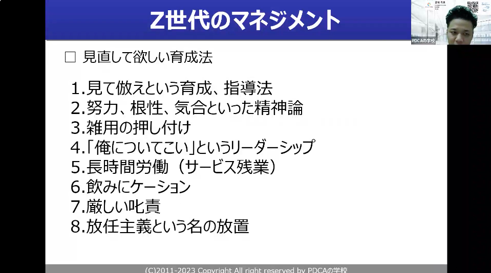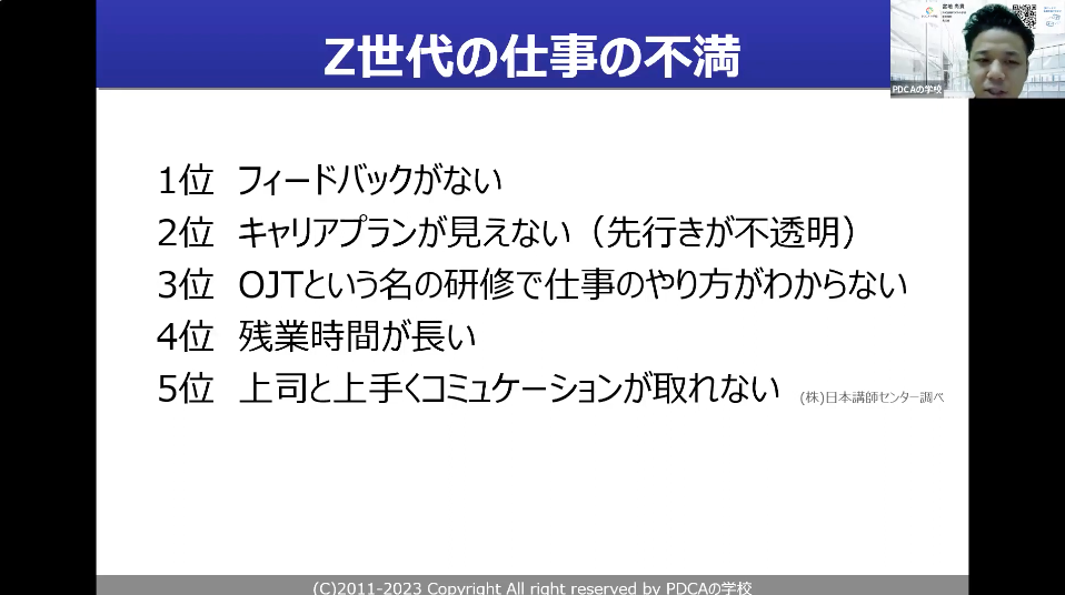 ただ、「ええ、こんな特徴なの?」と思われたように、やはりここらへんがギャップだと思うんです。なので、このあたりの指導がなかなかできていないばかりに、Z世代の方々が不満を抱えていることが多いです。
