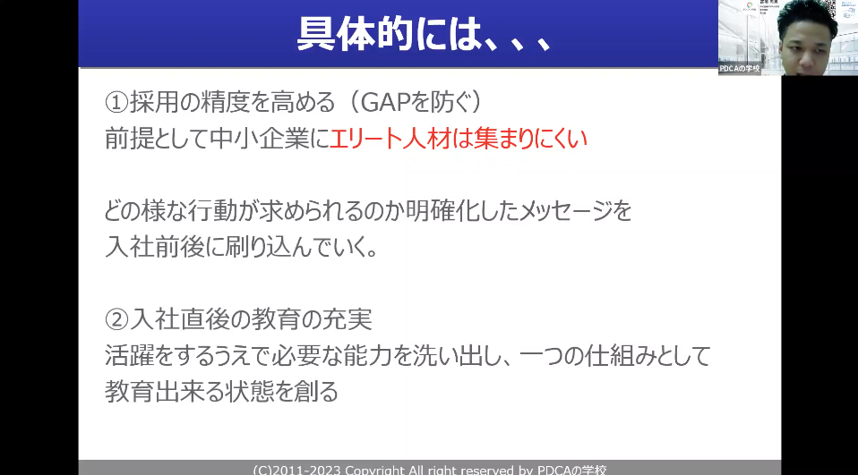 具体的にお伝えしますと、弊社もそうですが、前提として中小企業はエリート人材が集まりにくいなと思います。ただ、ミスマッチを防ぐことはできると思います。マッチしているか、マッチできていないかですね。
