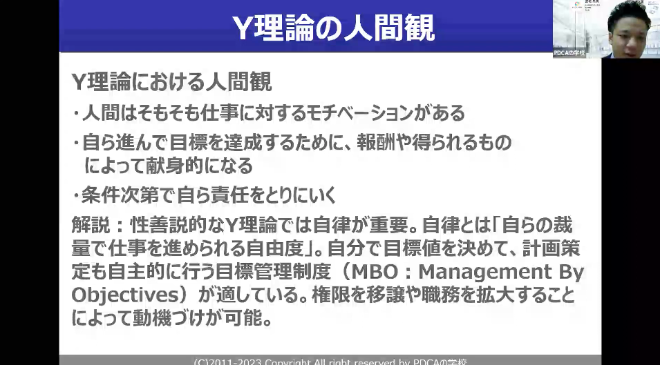 一方でY理論は、そもそもモチベーションを持っています。「目標達成するために動けます。条件次第では自ら責任も取りにいけます」という、要は優秀な人材だなというところです。