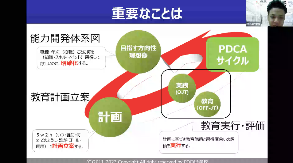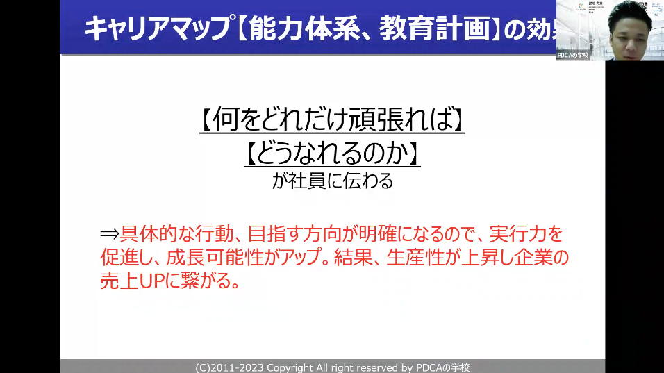 この能力開発体系図も、教育計画、お給料、評価制度と連動していないと効果が出づらいので、最終的にはその連動を目指していただけるとうれしいなと思います。