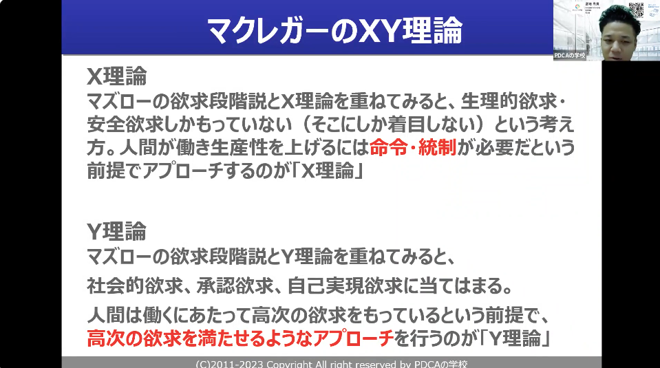 Y理論はどちらかというと、社会的欲求、承認欲求、自己実現の欲求を持っていて、満たされている。なので、高次元の欲求を満たせるようなアプローチ、特に一番上の自己実現を満たせるようなアプローチをしていく必要がありますよというのがY理論です。