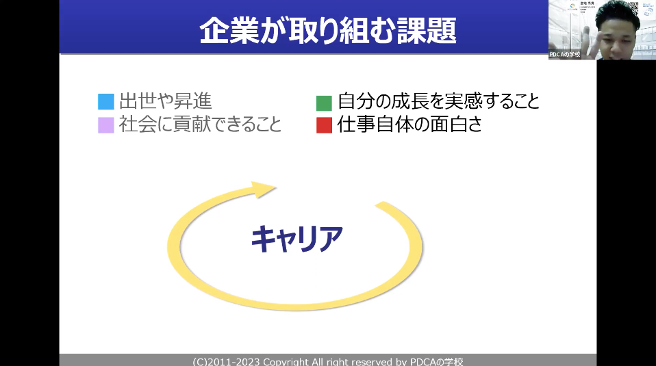 がんばることによって、1年後にどんな能力・資格ないしスキルや給与に反映されるのか、どんな成果が上がるのかを提示していく必要があるなと思います。