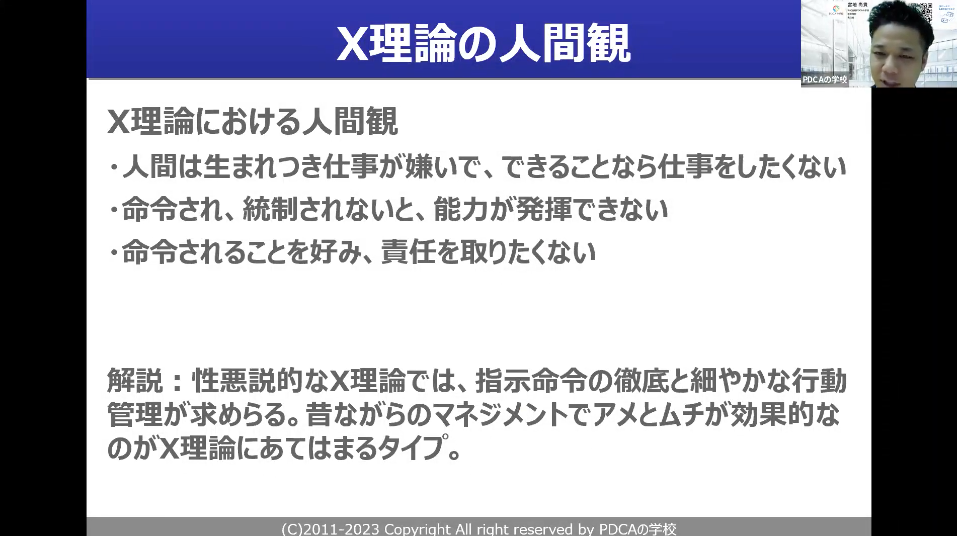 ですので、X理論においては指示・命令、徹底的に細やかな行動管理が求められる。どちらかというとマネジメントの中ではアメとムチじゃないですが、褒めて時には叱ってあげるというのが必要ですよ、というのがX理論です。
