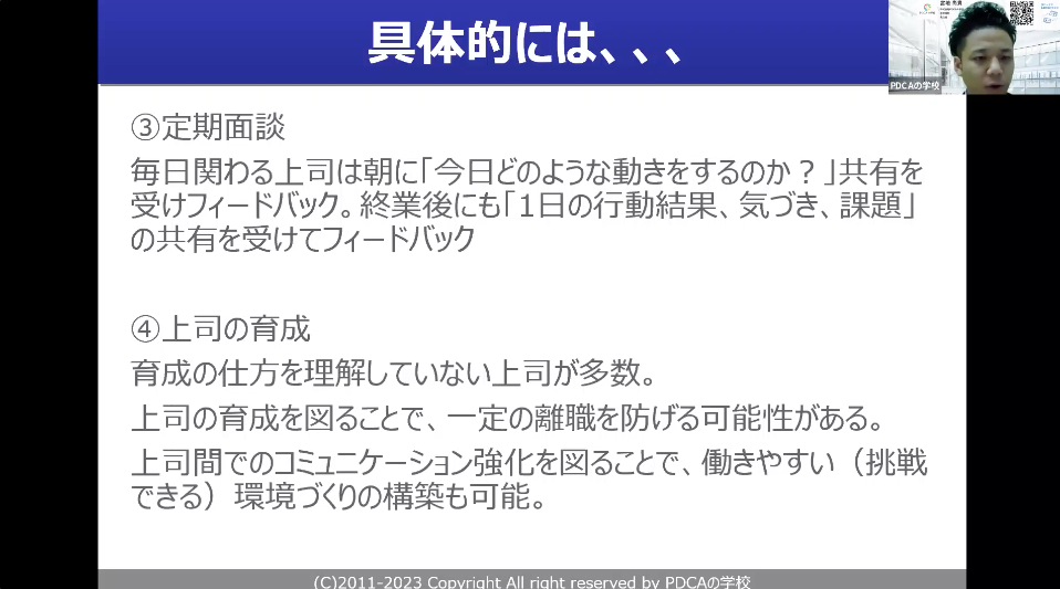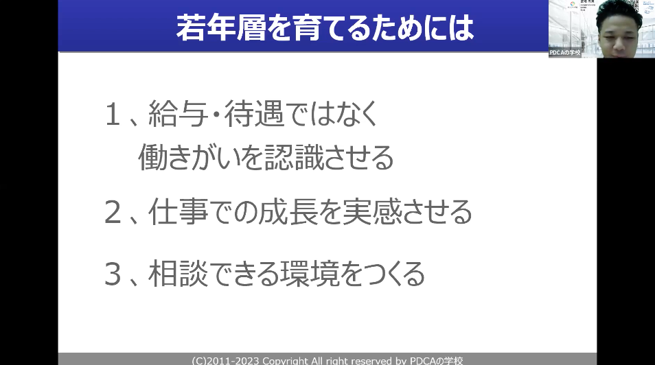 ですので一般的には、まずは相談できる環境を作る、仕事での成長実感を体験させる。あとは働きがいを認識させる。このあたりがキーワードとしては入ってきますので、ぜひ参考になればうれしいなと思います。