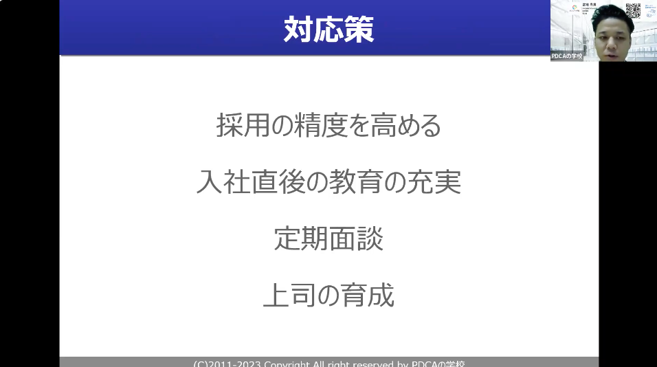ということで、X理論、Y理論を踏まえた対応策もお伝えできればなと思います。重ね重ねになりますが、絞っていくとこの4つになるのかなと思います。採用の精度を高めていく。入社直後の初期教育を充実させる。あとは定期面談ないし相談環境の醸成。そして上司の方の育成。