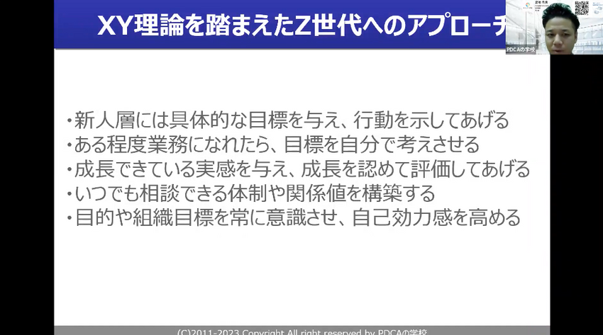 今の新人は自己成長意欲が高いのかとか、Z世代の特徴の中でそうなんじゃないかというのを挙げさせていただきましたが、X理論・Y理論的に言うと、やはり全員が全員そうではないので個別に対応していく必要があるんじゃないかなと思っています。