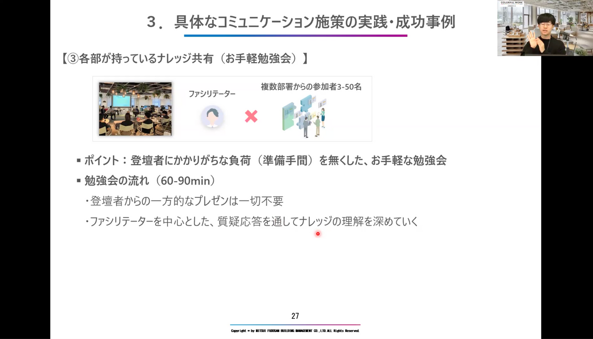 もう1つ投票が多かった施策である「③各部が持っているナレッジ共有(お手軽勉強会)」についてもご紹介させていただきます。