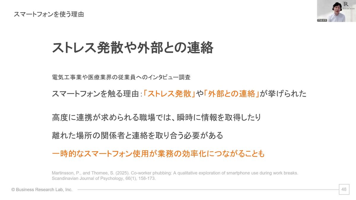 実際、こんな研究もあります。人はなぜスマートフォンを使うのかという調査で、その理由として「ストレス発散」や「外部との連絡」が挙げられました。ストレス発散は、先ほど触れた「リフレッシュ」にあたりますね。
