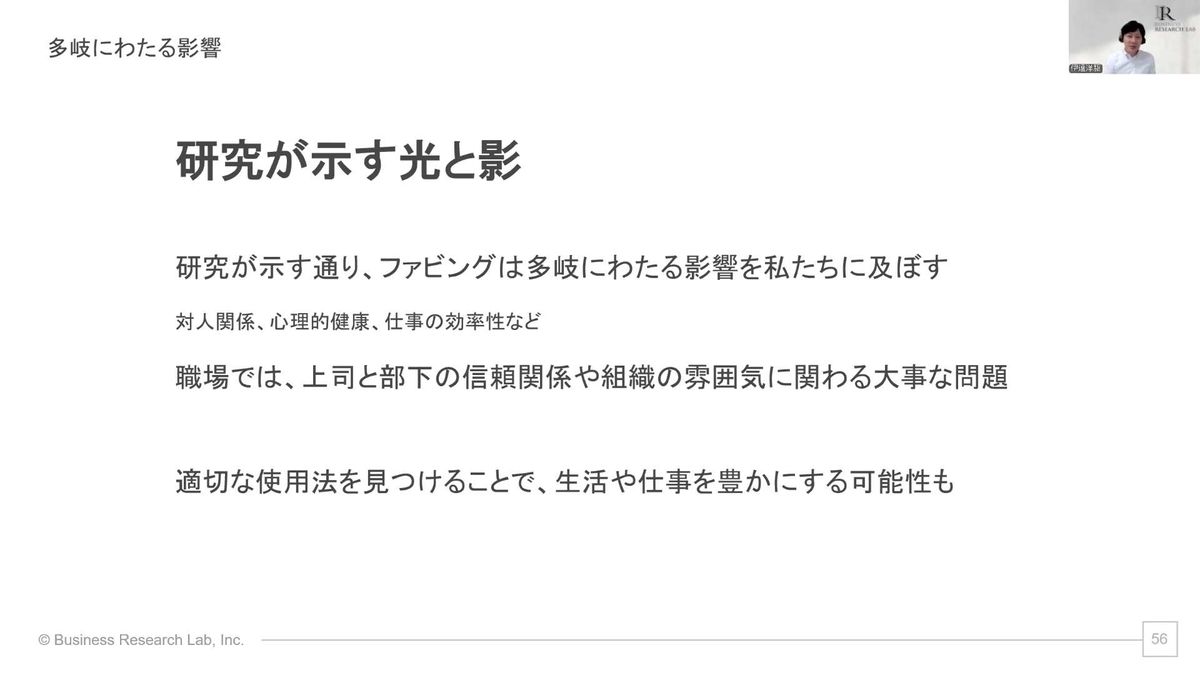 ここまでのお話では、基本的に「ファビング=相手との会話中にスマートフォンを見る行為はよくないこと」という前提で進めてきました。実際に、その前提はおおむね当たっていると思います。ファビングは、本人にとっても、周囲にとっても、さまざまなネガティブな影響を及ぼすということが研究から明らかになっているわけです。