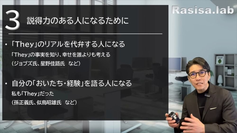 さぁ、では3つ目。説得力のある人になるためには、ある条件が必要なんです。メンバーは口先だけで言っても「あぁ、なんか言ってるね」となってしまいます。1つ目、Theyのリアルを代弁する人になる。口先だけじゃなくて、Theyの事実を知り、誰よりもTheyの幸せを考えている人になるということなんですよ。