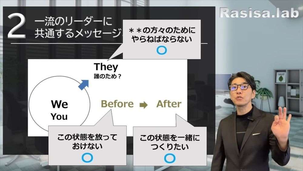 なので、こういった構造をちょっと整理をするだけでも随分と変わるんです。ぜひBefore、Afterで考えてください。あなたが尊敬する一流のリーダー、アニメのヒーロー、政治家もしくは歴史の偉人たち、経営者は、まずThey、Before、Afterになっているはずです。これは現場リーダーも知っておかねばならないことなんです。