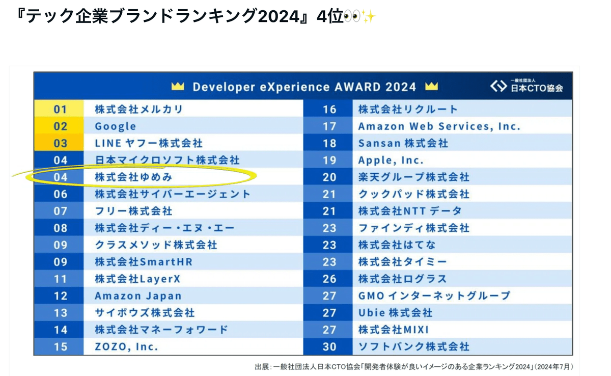 例えば、昨年2024年に日本CTO協会が実施したランキングでは、メルカリさんやGoogleさん、LINEヤフーさんに続いて、今は日本マイクロソフトさんと同率4位に来ています。
