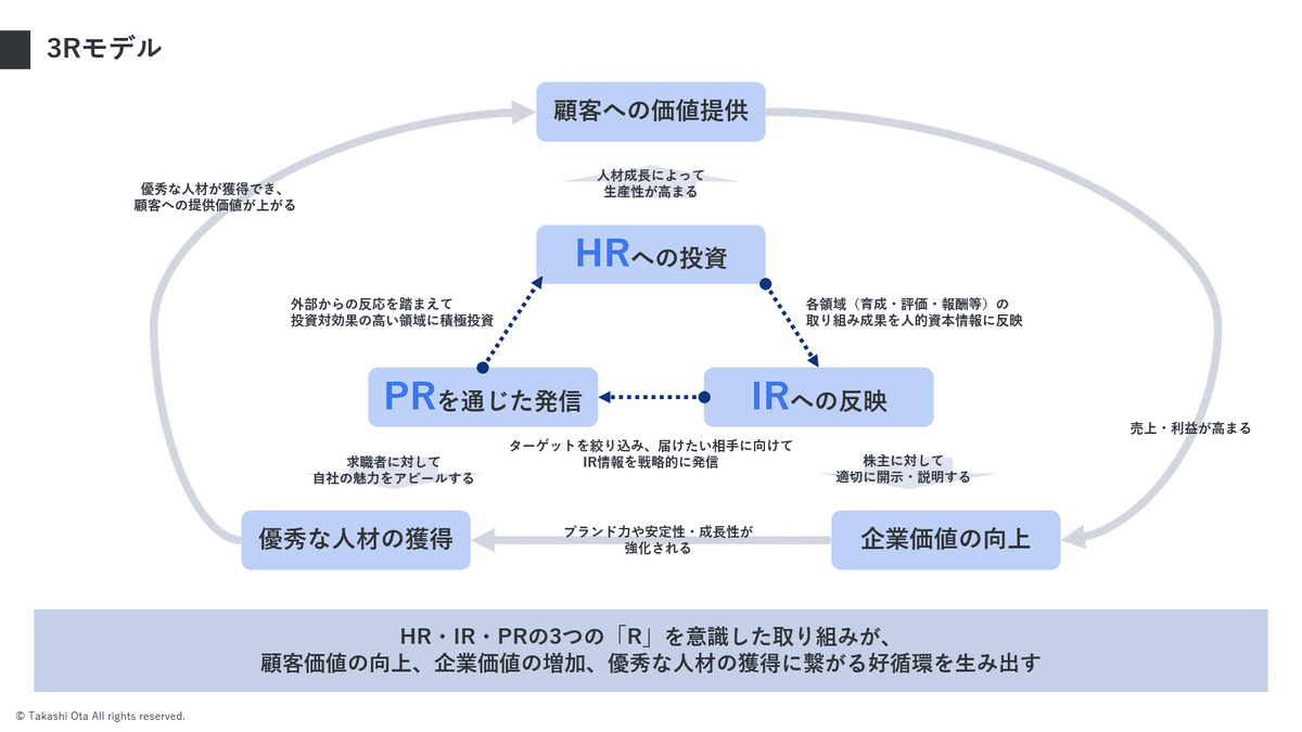 具体的には、HRで積み上げた実績をIR活動に活用し、その成果をさらにPR活動に活かすという形で、HR・IR・PRの「3R」を循環させる活動に取り組んでいます。