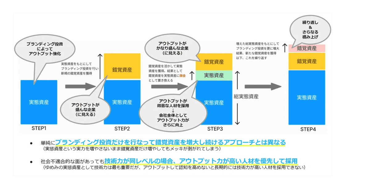 こうして生まれた“錯覚資産”をうまく活用しながら、さらに実績を積み重ねていくことで、やがて“実態資産”へと転換していく。ブランディング投資においては、こうしたステップも着実に踏んでいます。