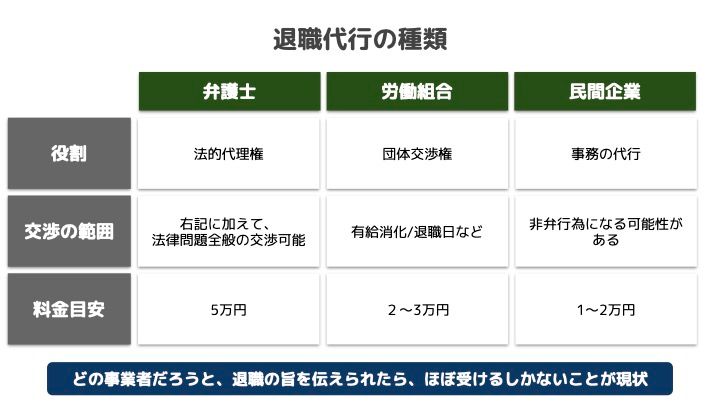 「これって法律上、規制とかないの?」って思うんですけれども。まぁ、あるはあるのですが、交渉するとなると、これは非弁行為なので弁護士さんの行為。弁護士法の範囲になりますので、交渉はできないんですね。労組系の場合は、一定の団体交渉権に基づいて、労組系の退職代行ができます。