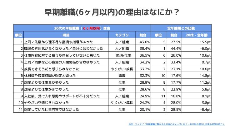 上から見ていくと「上司/先輩から理不尽な指摘や指導があった」「職場の雰囲気が良くなかった」「仕事内容に対する給与が見合っていなかった」「上司/同僚などの職場の人間関係が合わなかった」みたいな話ですね。
