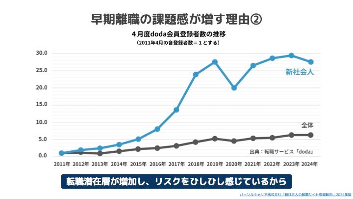 松島:ちょっと違う視点でみると、潜在的な「あ、すぐに辞めちゃいそうだな」っていうのは、みなさんひしひしと感じていると思うんですよね。ちょっと適しているかわからないんですけど、ご紹介したいわかりやすいデータが、4月に転職サイトに登録する人の推移ですね。
