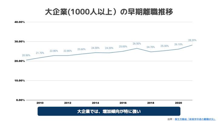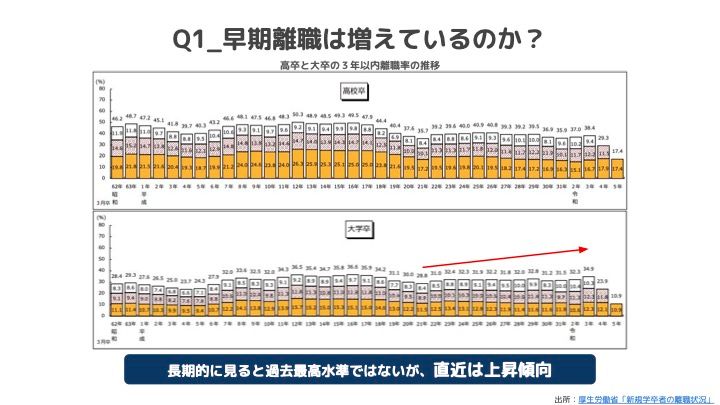 1つ目、「そもそも早期退職って増えているのか?」でいうと、これは厚生労働省のデータでございます。グラフが2つあるんですが、下の大卒を見てください。このグラフの見方としては、1年目で辞めた、2年目で辞めた、3年目で辞めたという積み上げになっているんですけど、直近10年ぐらいで見ると、やはり上昇傾向です。
