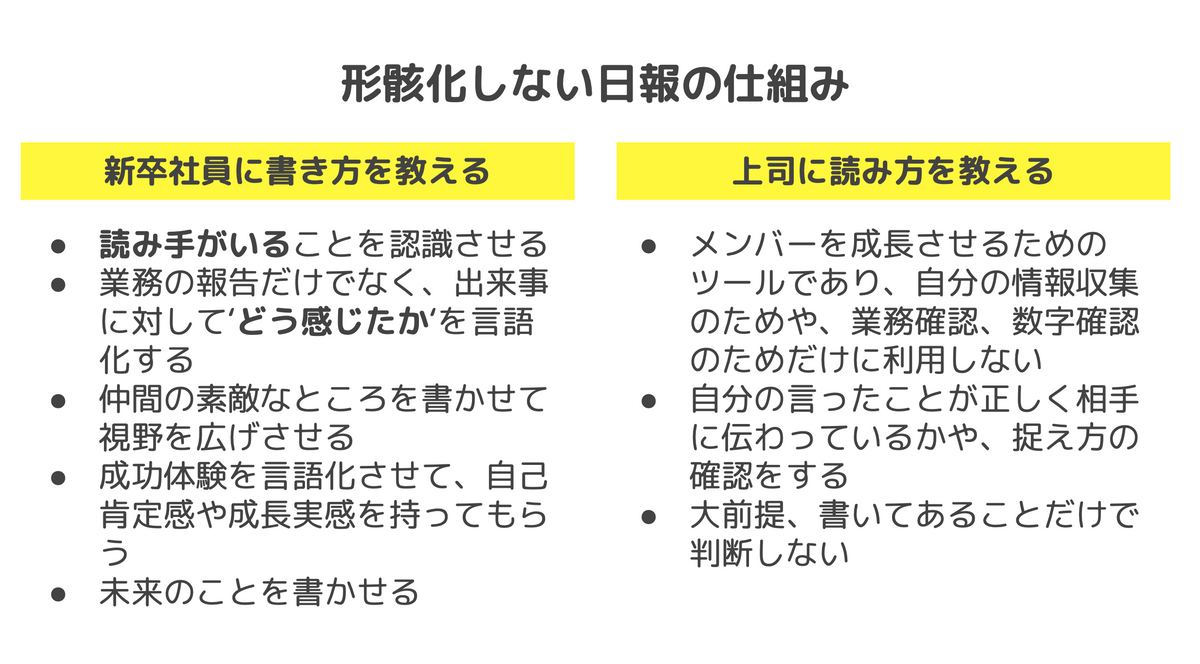 司会者:真ん中にある「日報の書き方を教える」。ちょっと具体的に見ていきたいなと思っていまして。