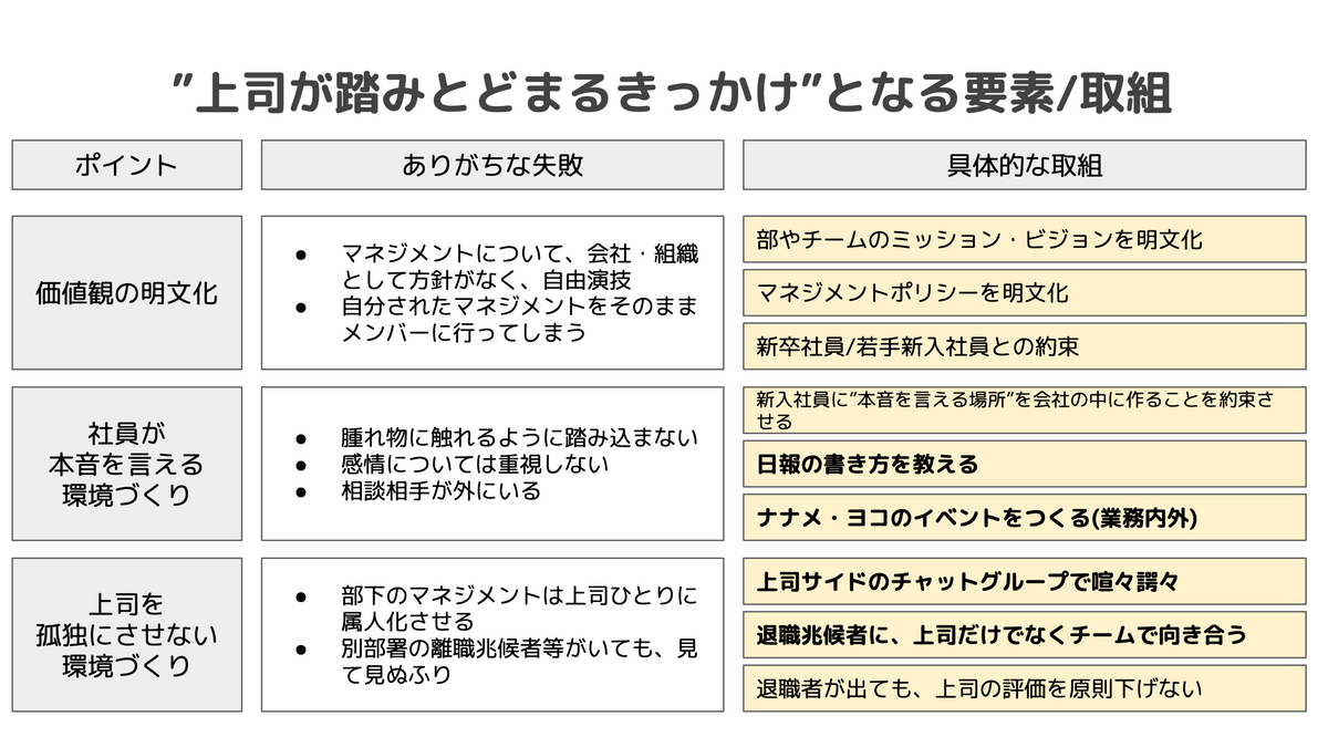もう1つは、マネジメント側ですね。上司とかマネジメント側で、メンバーにどう向き合うとか、コミュニケーションするとか、上司としてどうあるかというマネジメントポリシーを作ること。これに沿ってみんなが動くことがすごく大事ですかね。