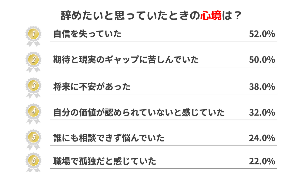 それで、その時の心境です。1位「自信を失っていた」。2位「期待と現実のギャップに苦しんでいた」とか、「将来に不安があった」「自分の価値が認められていないと感じていた」「誰にも相談できず悩んでいた」「職場で孤独だと感じていた」。