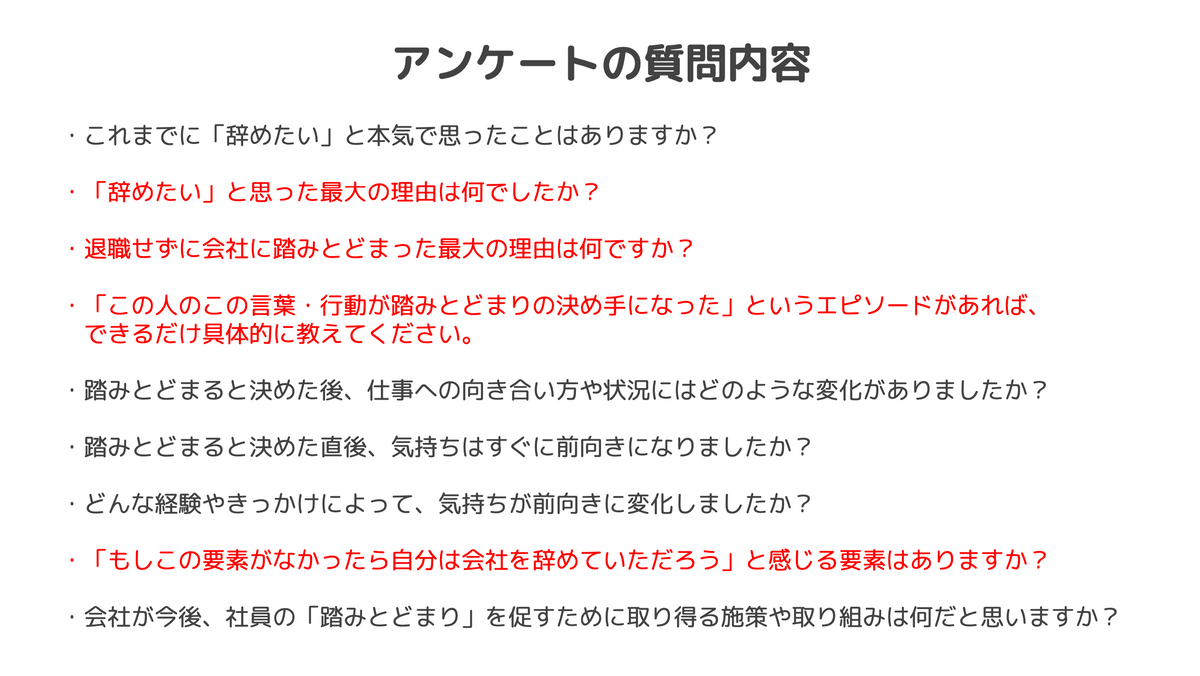 積極的踏みとどまりの事例や考察・分析がないかなぁと探しましたが、ありませんでした。なので、自分たちで取るしかないなと。Zenken株式会社は470人ぐらいの社員がいるんですけど、その中から「辞めたいと思ったことがある人」×「今活躍している社員」という50人を対象にアンケートを取りました。そこから踏みとどまりの考察をしていきたいなと思っています。