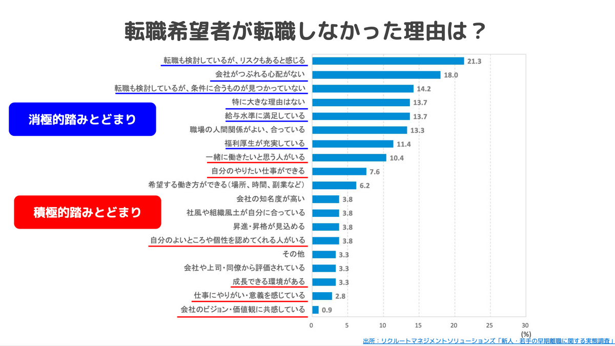 松島一浩氏(以下、松島):はい。辞めるのが悪いとか、そういう立場ではないんですけど。じゃあ、踏みとどまるというところ。これは転職希望者が転職しなかった理由についての、リクルートマネジメントソリューションズさんのデータです。