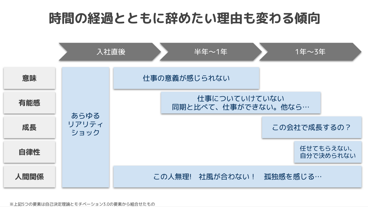 新保:先ほどのデータで、タイミングとかをいろいろ分析してやってみると、時期と辞めたい理由がラベリングできると思っていて。縦軸のラベリングは自己決定理論とモチベーション3.0という、いわゆるモチベーション系の理論を組み合わせて、意味、有能感、成長、自律性、人間関係にしています。これは順番になってくるなと。グラデーションがある。