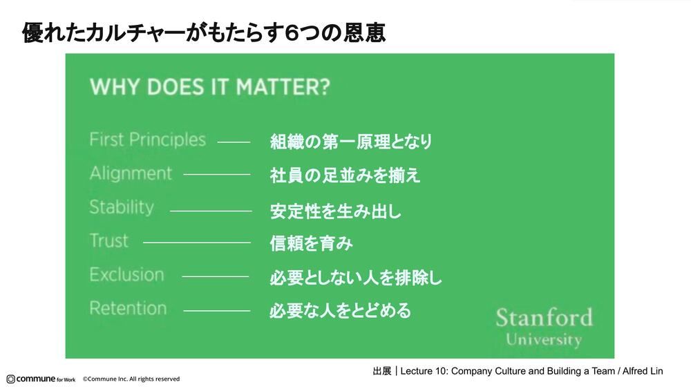 逆に言うとそういった人たちは、「自分の持っている価値観と、この会社がすごくすり合っていて、会社にいて心地がいい」と思ってくれる。なので、やはりカルチャーフィットは本当にエネルギーだと思っています。必要な人をとどめるといったように、いろんな場所で大きく6つのポジティブな影響があると思っております。