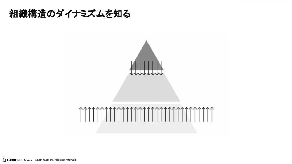 あらためてそれを図にして引いてみると、1つはこのピラミッドモデルですね。恐らく99.99パーセントぐらいの会社が基本的にはヒエラルキーで、「どフラットで正社員が10万人います」みたいな会社はほぼないと思うんですが、こういうヒエラルキー構造の中で、それぞれのマネジメント・レポートラインがある。