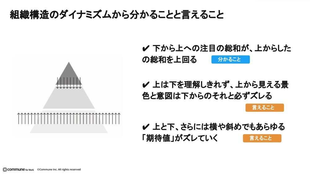 ズレるのは当たり前なんだけど、「なんかズレるよね」とか「理解してくれないよね」と、不満が出てくるのが組織、人間という生き物であるという感じです。なので、フラットに認識として重要なのは、前提としてズレるという構造があります。