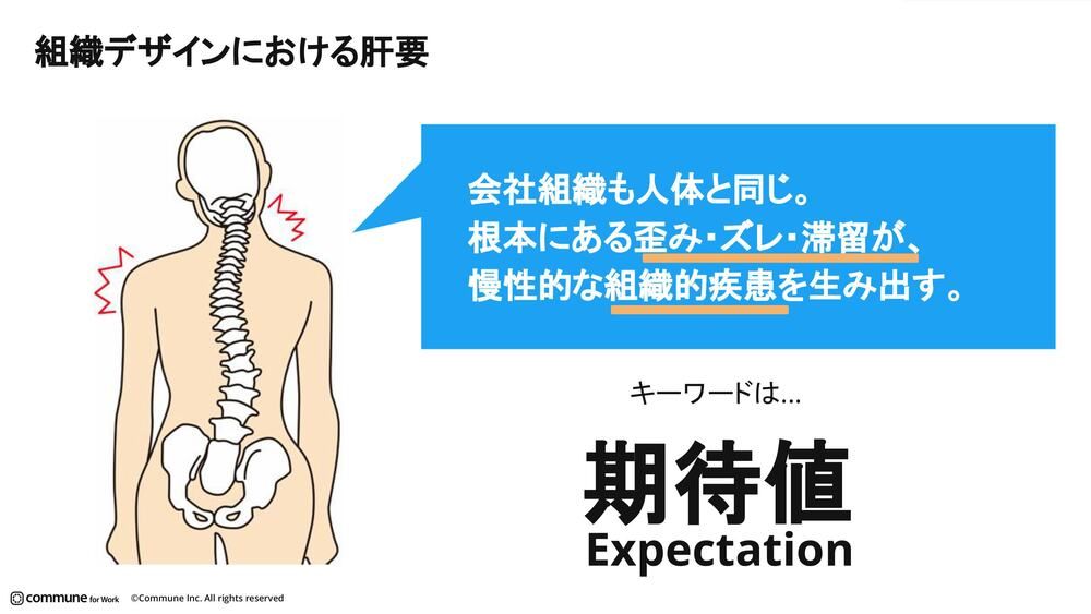 ということなので、慢性的な組織的疾患を生み出している歪み・ズレ・滞留みたいなものをいかに直していくか、矯正していくか。もしくはどう揃えていくかという上で、コミュニケーション上では「期待値」、こちら側が考えていることがものすごく大事です。