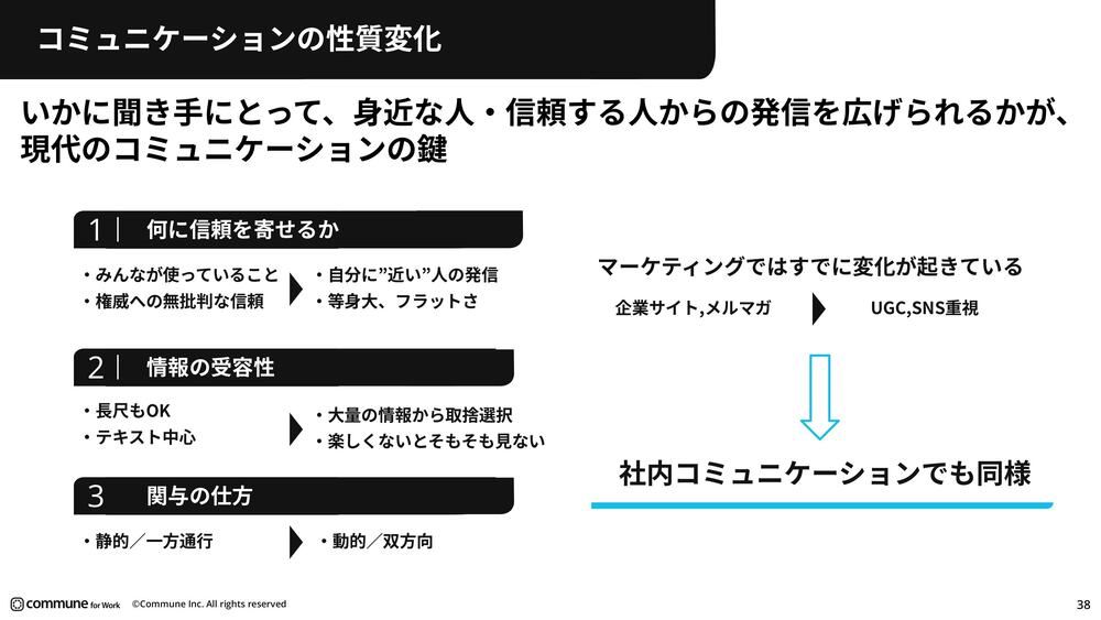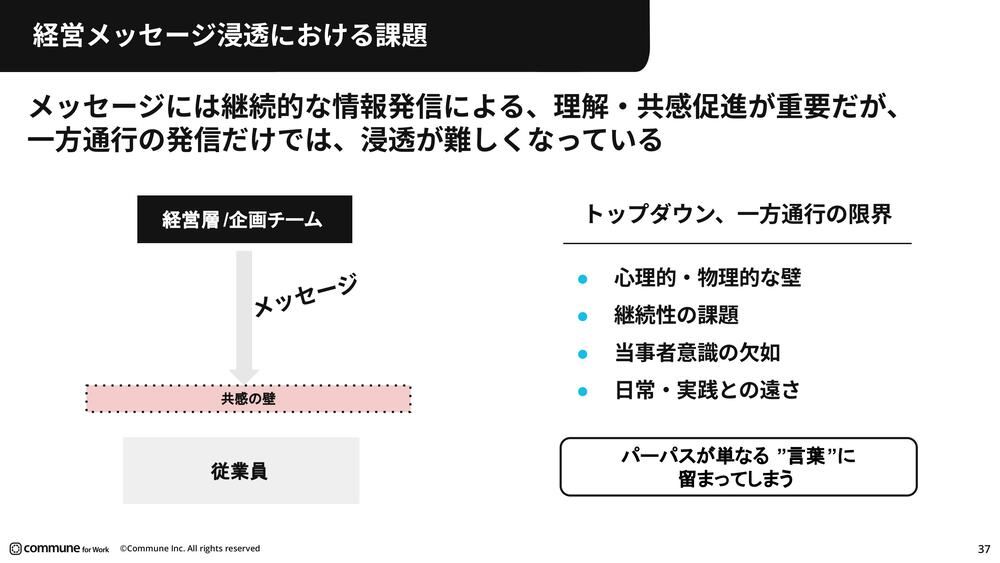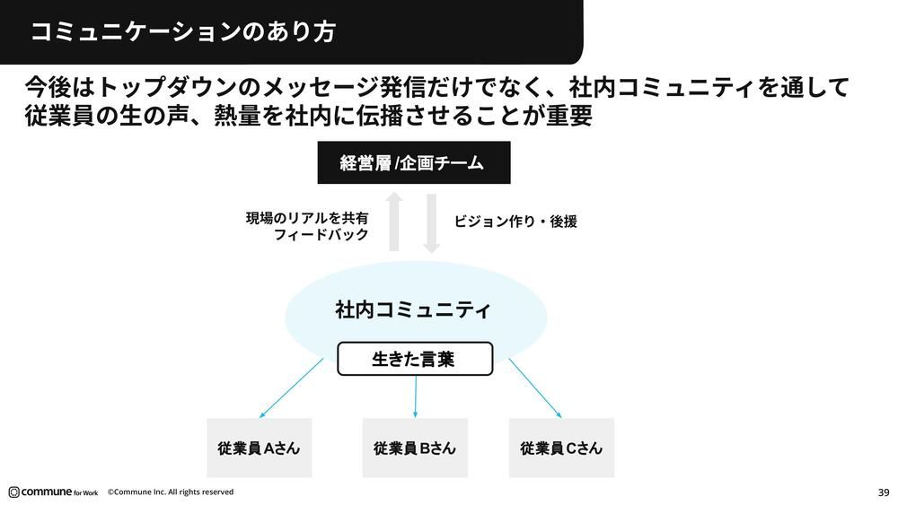 社内でもこれが大事かなと思っていて、キーマンからの生きた言葉をどういうふうに社内に伝播させていくか。その装置として、コミュニティというものを作っていくことが大事なのかなと思っております。