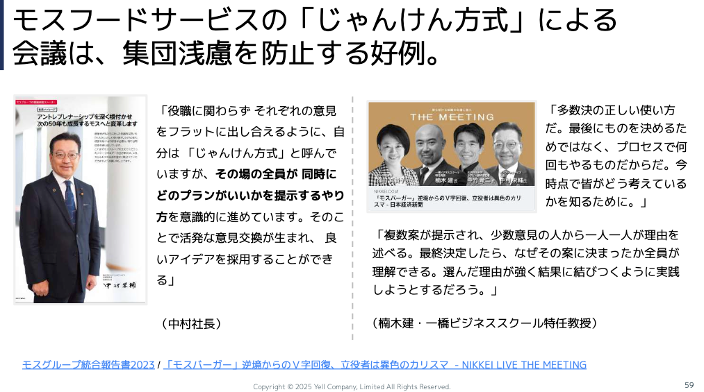 統合報告書の中でも「じゃんけん方式」って呼んでいらっしゃっていて、その場の全員が同時にどのプランがいいかを提示する。要は「A案がいい人はグー、B案がいい人はパーを出して」みたいにする。役員会でですよ。「はい、せーの、ドン!」って出すんです。