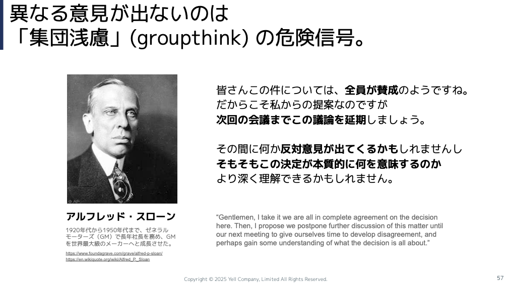 次、グループシンクの話ですね。導入部の『集団浅慮ー政策決定と大失敗の心理学的研究』の本が出るよりさらに前の1940年代です。アルフレッド・スローンはゼネラルモーターズ社長を長くされていた人で、GMを世界一の会社に育てた方なんです。