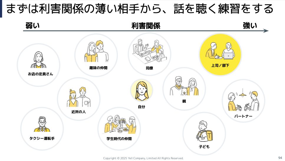 上司、部下が一番難しいです。車の運転で言うと、(スライド)左が仮免で右が首都高なので、いきなり首都高に突っ込むことはお勧めしないです。