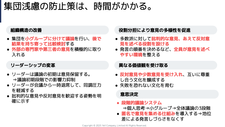 もう1個、この「時間がない」というお声に対して申し上げたいのは、「だから集団浅慮に陥るのでは?」っていう話なんですよね。もう1回集団浅慮の防止策を見ていくと、(スライドの)赤でハイライトしたところは全部、時間がかかるんですよ。「『わざわざいったんグループに分けて議論してから持ち寄りましょう』って、一発でやればいいんじゃないですか?」っていう話ですし。