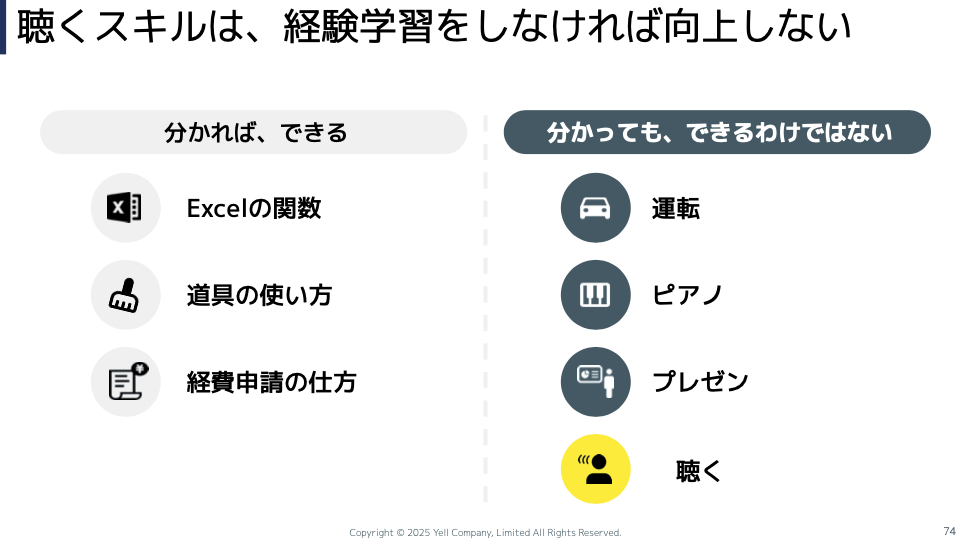 わかっていてもできないスキルっていっぱいありますよね。ピアノとか運転とかプレゼンとかもそう。「聴く」はこの側のスキルなんです。