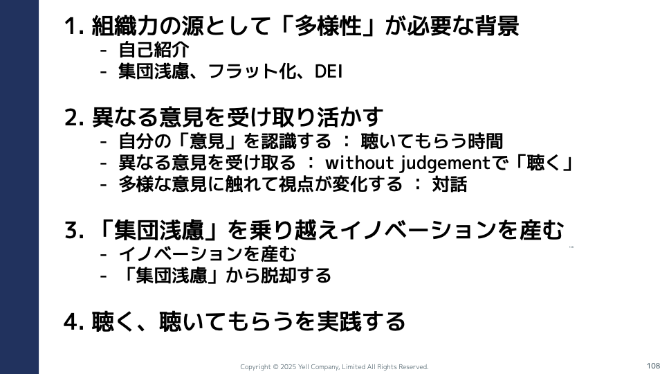 すいません、ちょっと最後のパートがとても駆け足になってしまいましたけれども、ここまでお時間をいただいて、そもそも多様性が必要な背景に、集団浅慮を防ぐためであること、社会の構造がフラット化に向かっていることを申し上げました。