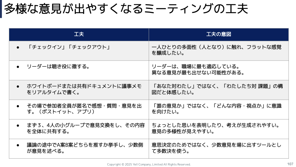 最後に対話です。これは『集団浅慮ー政策決定と大失敗の心理学的研究』の本に書いてあることですが、多様な意見が出やすくなるミーティングの工夫って、けっこうたくさんできることがあるんですよね。
